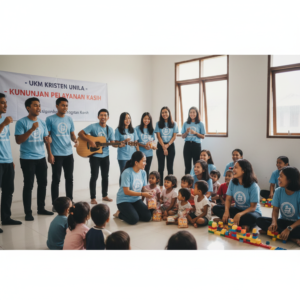 UKM Kristen Unila melakukan pelayanan ke panti asuhan melalui ibadah singkat, permainan bersama anak-anak, dan pemberian bantuan. Kegiatan ini membawa sukacita sekaligus menjadi sarana edukasi rohani bagi peserta. Interaksi hangat antara mahasiswa dan anak-anak membuat suasana berlangsung penuh keakraban. Mahasiswa berkesempatan melihat langsung kebutuhan dan tantangan yang dihadapi anak-anak panti.